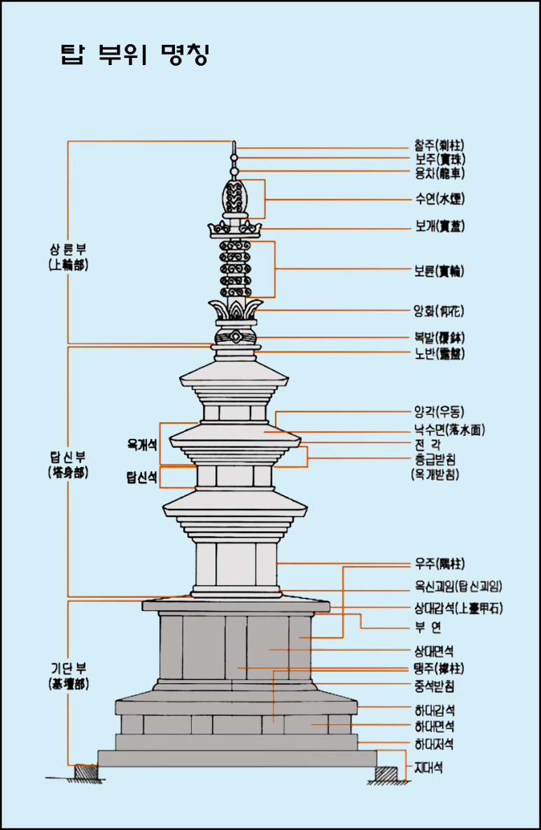 탑(塔)은 인도의 스투파(Stupa)를 한자로 표기한 탑파(塔婆)에서 시작되었다. 원래 석가모니의 사리(舍利)를 봉안하기 위해 만들어진 건조물을 의미합니다.