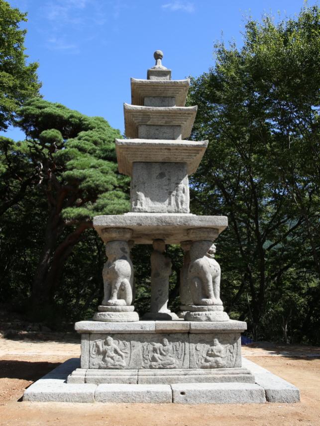 ① 통일 신라시대 ② 탑신의 1층에 보살상(菩薩像)과 신장상(神將像), 2층에 음악을 연주하는 천인상(天人像), 3층에 천인좌상(天人坐像)을 새겼다. 지붕돌 밑면에는 연꽃무늬를 새겼는데 3층만은 삼존상(三尊像)이 새겨져 있는 모습들의 조각으로 화려하게 장식하는 등 형식에 얽매이지 않음 ③ 높이는 5m